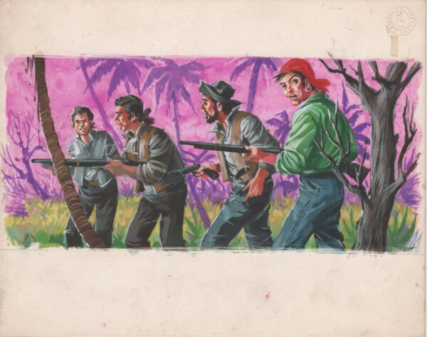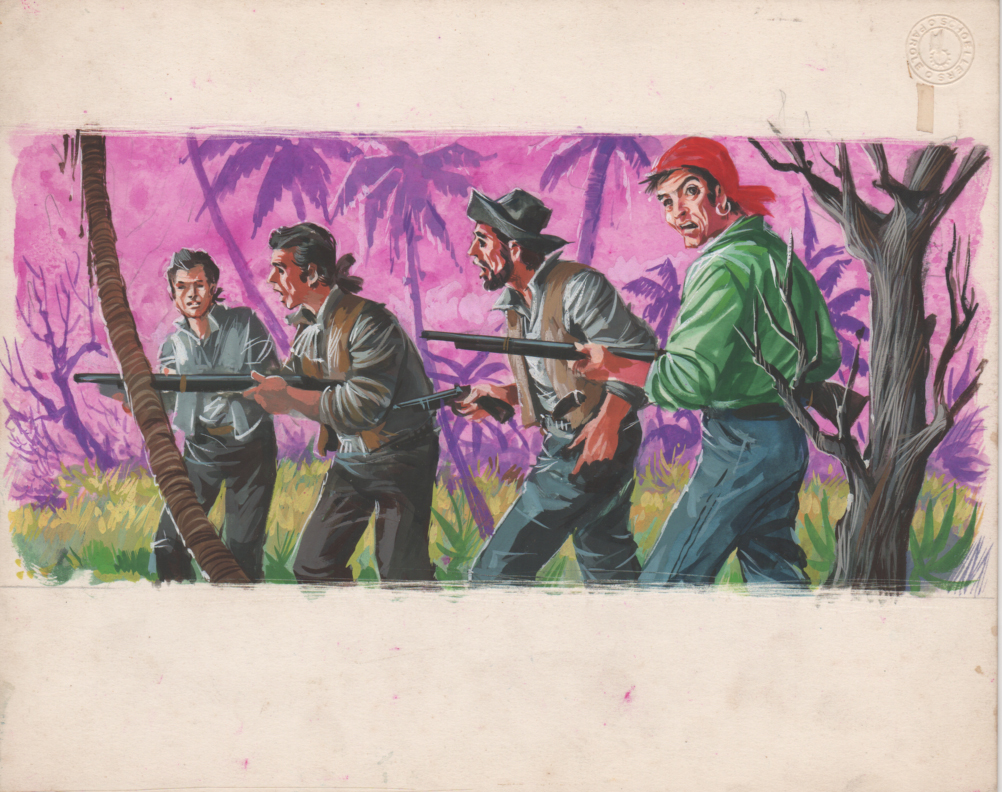Giu Pin è uno di quei magnifici illustratori di cui abbiamo perso memoria e di cui c’è rimasta solo la sigla con cui si firmava. La tecnica utilizzata per questa illustrazione è una tecnica mista di Tempere ed acquarelli su cartoncino rigido; Qui viene rappresentato un gruppo di uomini nella jungla. La prima pubblicazione è avvenuta nel 1964 presso l’editore Europea editrice; il volume è stato ripubblicato negli anni ’80 da Edizioni Nuzzo.