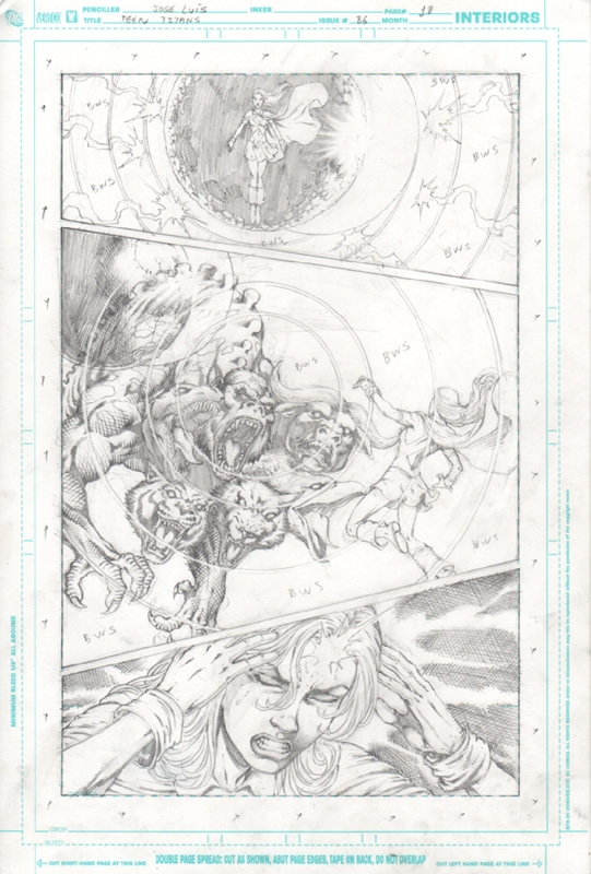 Tavola originale del comic book americano Teen Titans, realizzata a matita da José Luis sulle pagine che la casa editrice americana da in dotazione ai suoi disegnatori. In questa pagina vediamo un Attacco a Miss Martian.