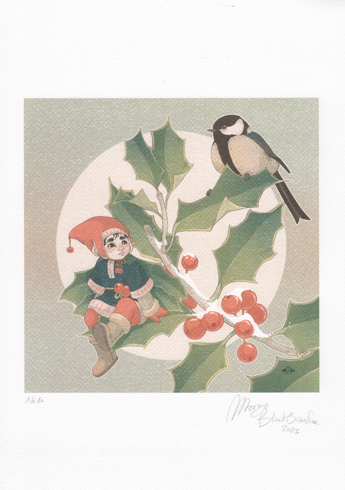 Stampa a tiratura 10 rappresentante la Llex Acquifolium, illustrazione presente nel calendario Arbor Spiritum di Marga Biazzi